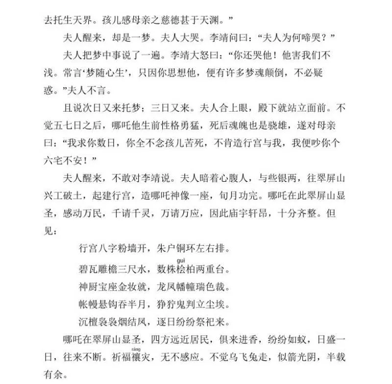 他已“还了父母骨肉”,不能再忍受下去,在得到莲花化身成形以后,就采取“下山报仇”的举动。他把自己的父亲当作“对头”看待,见面直呼其名,用枪刺去。李靖大败而逃,他还紧追不舍……